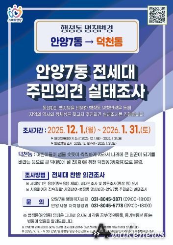 조사방법은 올해 12월 1일부터 2026년 1월 31일까지 시 홈페이지를 통해 비대면 조사를 진행하고, 12월 18일부터 2026년 1월 31일까지 안양7동 행정동명칭변경추진위원회가 각 세대 방문조사를 병행하게 된다.