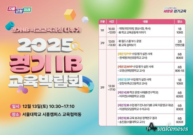 어웨이크뉴스 오경하 기자 | 경기도교육청이 오는 12월 13일 도내 교원 및 교육전문직원을 대상으로 ‘2025 경기 아이비(IB) 교육박람회’를 개최한다. 학교 맥락에 기반한 ‘IB 교육’ 실천 사례 나눔으로 미래형 수업과 평가 일반화에 도움을 주고자 마련한 자리다.