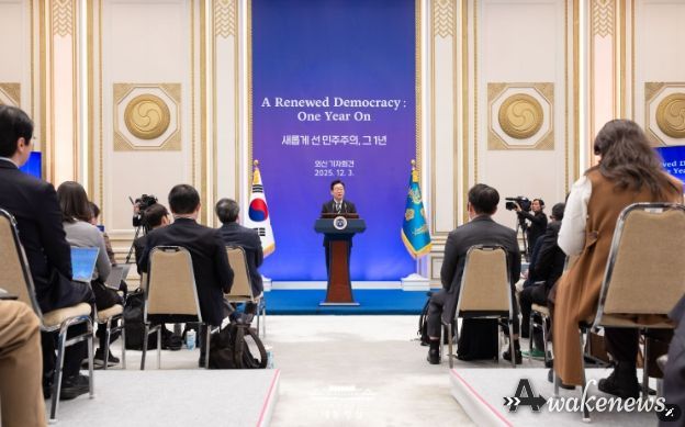 어웨이크뉴스 오경하 기자 | 이재명 대통령은 3일 청와대 영빈관에서 열린 '민주주의 회복 1년 계기 외신 기자회견'에서 "가장 최근에 2024년 12월 3일부터 시작된 우리 국민들의 '빛의 혁명'으로 전 세계가 놀랄만한 친위쿠데타 진압, 그리고 민주정부 수립이 이뤄졌다"고 평가했다.