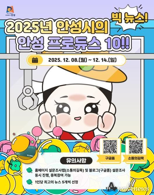 어웨이크뉴스 오경하 기자 | 안성시는 8일부터 14일까지 7일간 ‘2025년을 빛낸 안성시 10대 뉴스’ 선정을 위한 온·오프라인 시민 투표를 진행한다고 밝혔다.