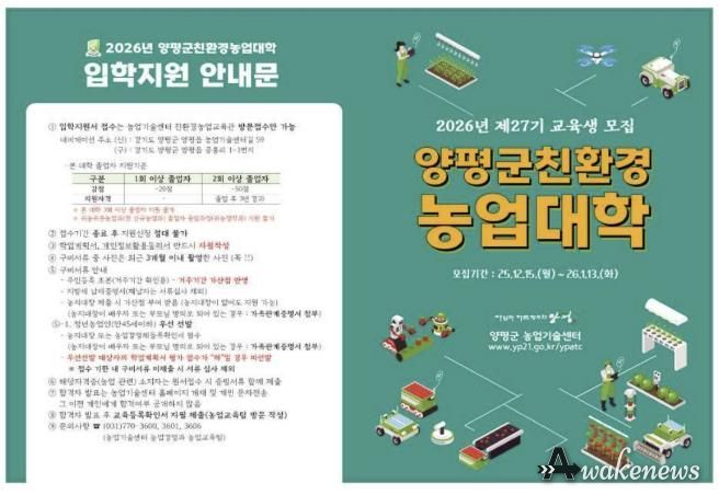어웨이크뉴스 오경하 기자 | 양평군은 15일부터 관내 농업인 및 군민을 대상으로 ‘2026년 제27기 양평군 친환경농업대학’ 신규 교육생을 모집한다고 밝혔다.