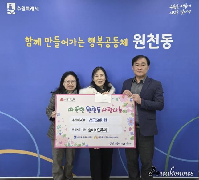 어웨이크뉴스 오경하 기자 | 지난 18일, 원천동에 소재한 송이비인후과는 지역사회 나눔 실천의 일환으로 원천동행정복지센터에 성금 50만 원을 기부했다.