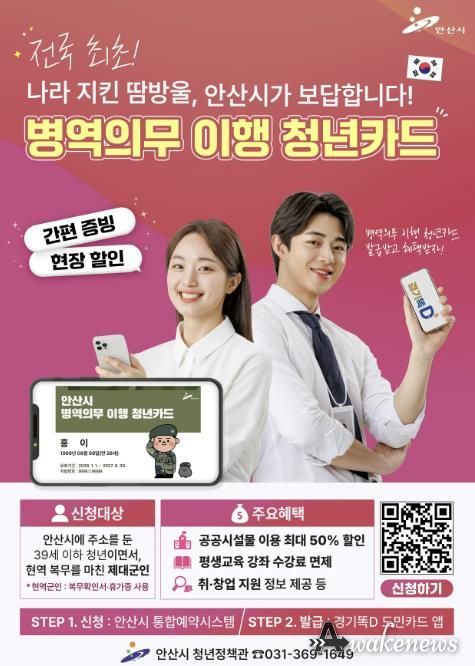 어웨이크뉴스 오경하 기자 | 안산시는 내년 1월부터 병역의무를 성실히 이행한 청년을 예우, 지원하기 위해 전국 최초로 ‘병역의무 이행 청년카드’를 온라인으로 발급한다고 22일 밝혔다.