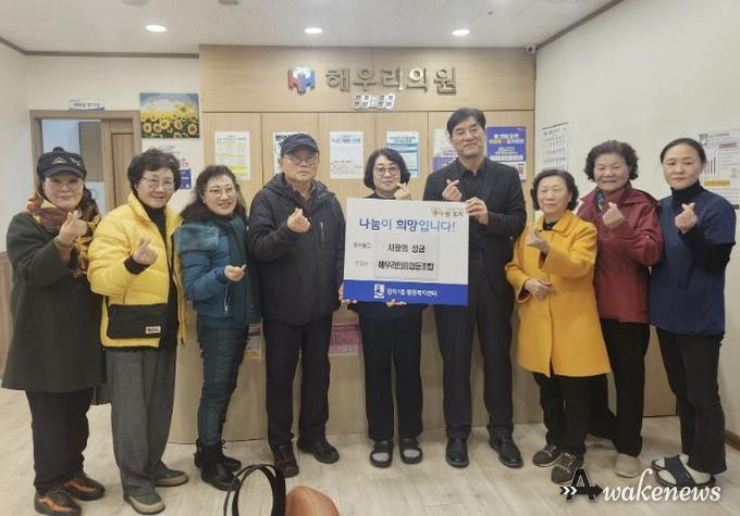 어웨이크뉴스 오경하 기자 | 수원시 장안구 정자1동은 지난 19일 해우리의료소비자생활협동조합이 지난 19일 연말을 맞아 어려운 이웃을 돕기 위해 조합원 및 임직원들이 모금한 성금 974천원을 기부해 왔다고 밝혔다.