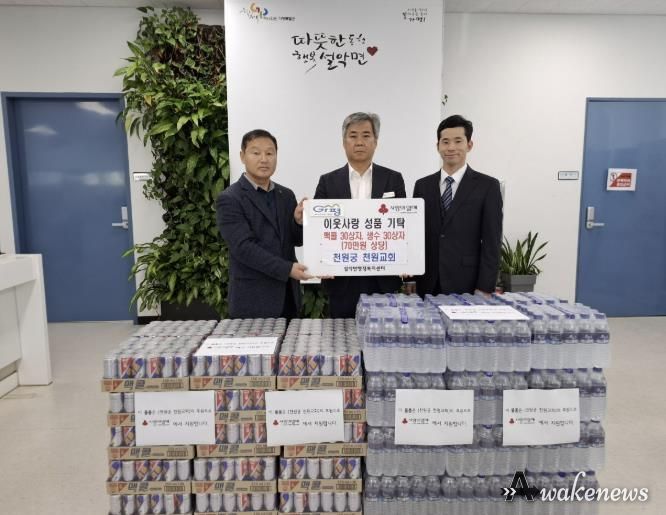 어웨이크뉴스 오경하 기자 | 천원궁 천원교회 권순구 교구장 외 임원진은 최근 가평군 설악면 행정복지센터를 방문에 이웃돕기 성품으로 맥콜 30상자와 생수 30상자를 기탁했다.