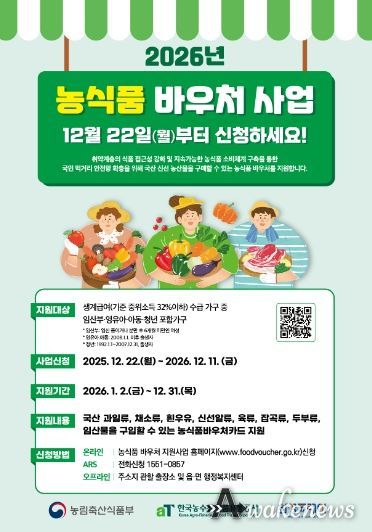 신태식 농식품유통과장은 “이번 농식품 바우처 지원사업을 통해 저소득 취약계층의 건강한 식생활을 돕고 지역 농산물 소비를 촉진하는 데 기여할 수 있을 것으로 기대한다”며 “사업이 원활하게 진행될 수 있도록 철저히 준비하겠다”고 말했다.