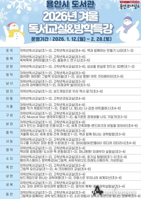 어웨이크뉴스 오경하 기자 | 용인특례시는 내년 1월 12일부터 2월 28일까지 도서관에서 겨울 독서 교실과 방학 특강을 운영한다고 밝혔다.