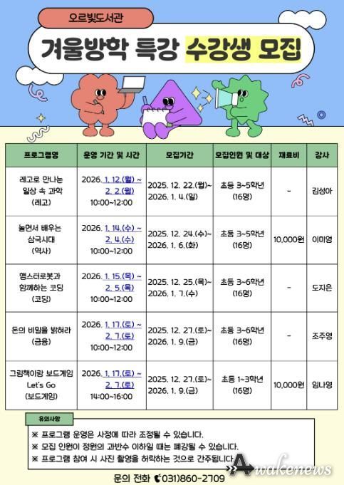 어웨이크뉴스 오경하 기자 | 동두천시 도서문화사업소 오르빛도서관은 겨울방학을 맞아 관내 초등학생이 다양한 주제를 흥미롭게 체험하며 사고력과 표현력을 키울 수 있는 겨울방학 특강 프로그램을 운영한다고 밝혔다.