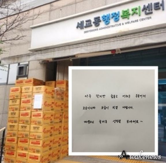 23일 오전, 세교동 행정복지센터 입구에는 이름을 밝히지 않은 기부자가 남기고 간 메모와 라면 100상자가 놓여 있었다.