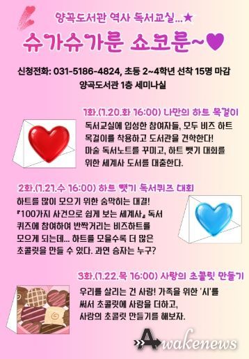 어웨이크뉴스 오경하 기자 | 김포시는 2026년 1월 20일 오후 4시부터 6시까지 1층 세미나실에서 초등학교 2~4학년을 대상으로 한 역사 독서교실 '슈가슈가룬 쇼코룬'을 운영한다.