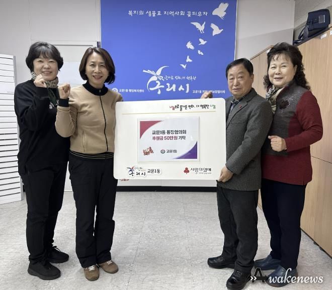 어웨이크뉴스 오경하 기자 | 구리시 교문1동 통장협의회는 지난 12월 23일, 지역 내 어려운 이웃을 돕기 위한 후원금 50만 원을 교문1동 행정복지센터에 기탁하며 따뜻한 나눔을 실천했다.