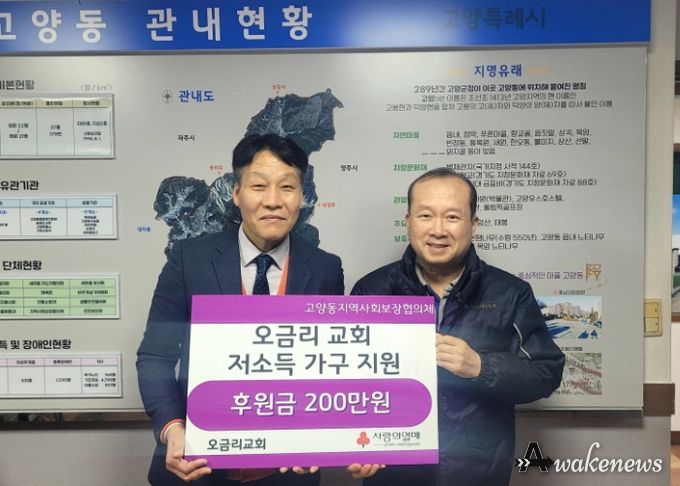 어웨이크뉴스 오경하 기자 | 고양특례시 덕양구 고양동은 지난 23일 오금리교회에서 경제적 어려움을 겪는 이웃을 돕기 위해 고양동 지역사회보장협의체에 후원금 200만 원을 기탁했다고 밝혔다.