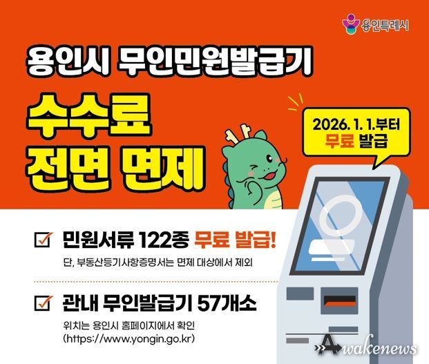 어웨이크뉴스 오경하 기자 | 용인특례시는 2026년 1월 1일부터 지역 내 설치된 무인민원발급기에서 발급되는 민원서류 수수료를 전면 면제한다고 25일 밝혔다.