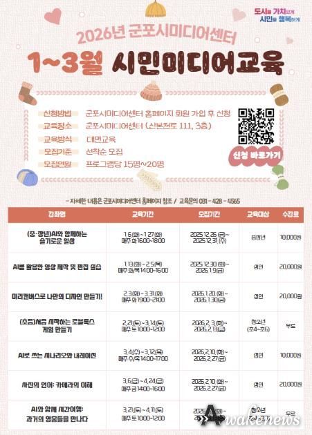 어웨이크뉴스 오경하 기자 | 군포시미디어센터는 시민들의 미디어 활용 역량 강화를 위해 2026년 1분기 미디어교육 프로그램 수강생을 모집한다.