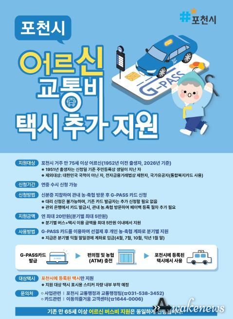 어웨이크뉴스 오경하 기자 | 포천시는 2026년부터 포천시에 거주하는 만 75세 이상 어르신을 대상으로 ‘포천시 만 65세 이상 어르신 교통비 지원사업’에 택시 이용을 추가 지원한다.