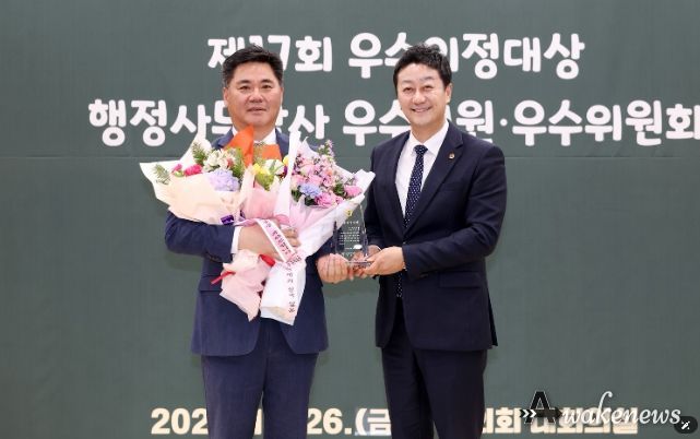 어웨이크뉴스 오경하 기자 | 경기도의회 경제노동위원회 정하용 의원(국민의힘, 용인5)이 26일 열린 2025년 경기도의회 의원 종무식 및 시상식에서 대한민국시도의회의장협의회가 주관하는 ‘제17회 우수의정대상’ 및 경기도의회가 주관하는 ‘2025년 행정사무감사 우수의원’을 동시에 수상하는 영예를 안았다.
