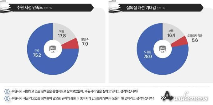 어웨이크뉴스 오경하 기자 | 수원시민 4명 중 3명은 “수원시가 일을 잘하고 있다”고 생각하는 것으로 나타났다. 시민 일상과 밀접한 생활밀착형 정책이 시정 만족도를 높이고 있는 것으로 보인다.