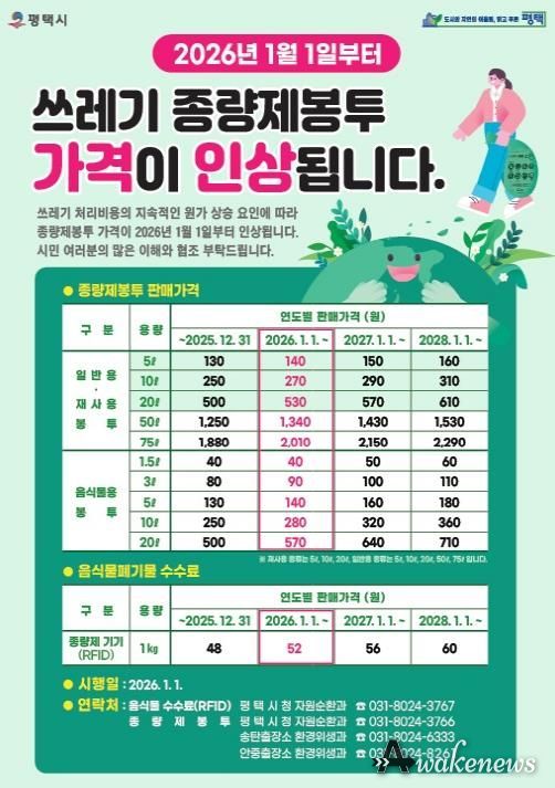 어웨이크뉴스 오경하 기자 | 평택시는 2026년 1월 1일부터 쓰레기 종량제 봉투 가격을 3개년도에 걸쳐 인상한다.