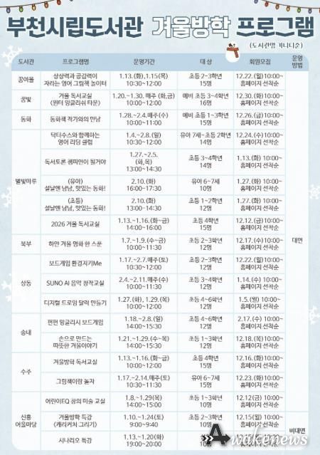 어웨이크뉴스 오경하 기자 | 부천시는 겨울방학을 맞아 내년 1월부터 2월까지 부천시립도서관에서 전 연령을 대상으로 독서문화 프로그램과 행사를 운영한다고 30일 밝혔다. 이번 프로그램은 연령과 관심사에 따라 다양한 참여 기회를 제공하기 위해 마련됐다.