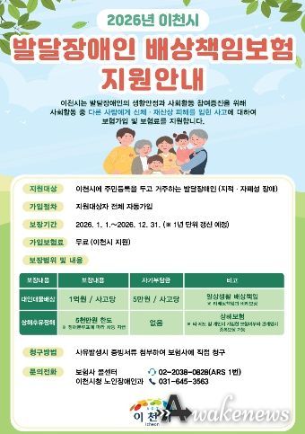 어웨이크뉴스 오경하 기자 | 이천시는 2026년 1월 1일부터 경기도 최초로 발달장애인을 위한 배상책임보험 가입 지원을 시행한다고 밝혔다.