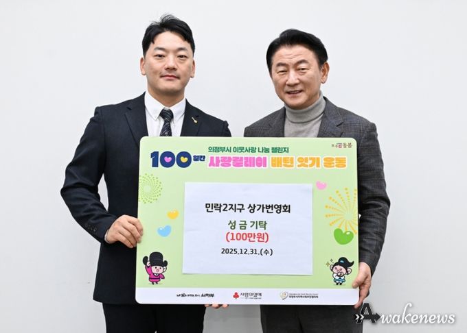 어웨이크뉴스 오경하 기자 | 의정부시는 12월 31일 민락2지구 상가번영회와 번영회 회원인 보람주식회사가 ‘100일간 사랑릴레이 배턴 잇기’에 동참해 성금 100만 원과 화장품(100만 원 상당)을 기부했다고 밝혔다.