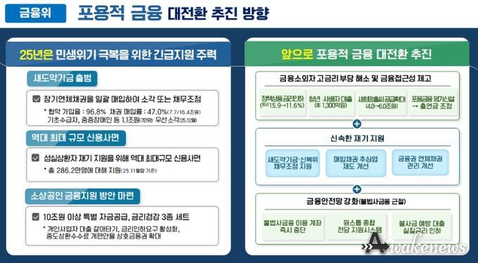 어웨이크뉴스 오경하 기자 | 2026년 1월 8일 금융위원회는 경기도 수원 서민금융통합지원센터에서 '포용적 금융 대전환' 1차 회의를 개최했다. 8일 회의는 정부·유관기관 뿐만 아니라 5대 금융지주와 포용금융 민간전문가도 참석하여 앞으로 정부와 민간이 함께 추진해 나가야할 포용금융 방향을 모색하는데 초점을 맞추었다.