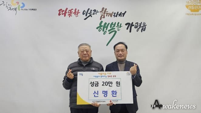 어웨이크뉴스 오경하 기자 | 가평군 가평읍은 최근 가평읍 지역사회보장협의체 위원으로 활동하는 신명환 위원이 행정복지센터를 방문해 취약계층 이웃돕기 성금 20만 원을 기탁했다고 밝혔다.