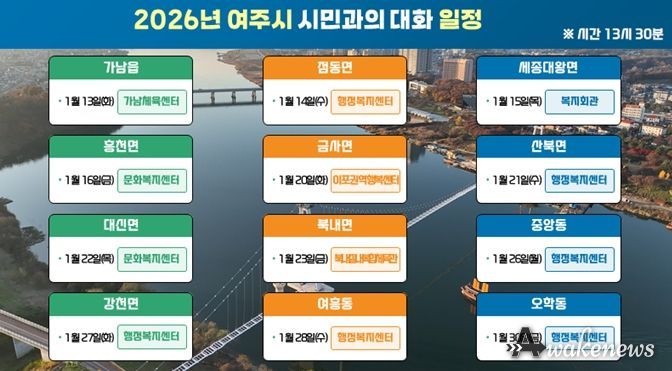 ‘2026년 시민과의 대화’는 △2026.1.13.(가남읍, 가남체육센터) △2026.1.14.(점동면, 행정복지센터) △2026.1.15.(세종대왕면, 복지회관) △2026.1.16.(흥천면, 문화복지센터) △2026.1.20.(금사면, 이포권역행복센터) △2026.1.21.(산북면, 행정복지센터) △2026.1.22.(대신면, 문화복지센터) △2026.1.23.(북내면, 북내실내복합체육관) △2026.1.26.(중앙동, 행정복지센터) △2026.1.27.(강천면, 행정복지센터) △2026.1.28.(여흥동, 여흥체육공원 실내체육관) △2026.1.30.(오학동, 행정복지센터) 순으로 진행된다.