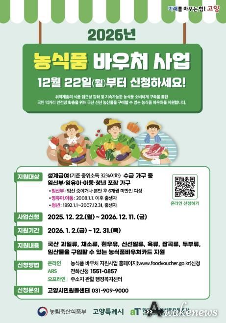 어웨이크뉴스 오경하 기자 | 고양특례시는 올해부터 지역 내 취약계층의 균형 잡힌 식생활을 지원하고, 농식품 소비 촉진을 돕기 위해 ‘농식품 바우처 사업'을 확대 시행한다고 13일 밝혔다.
