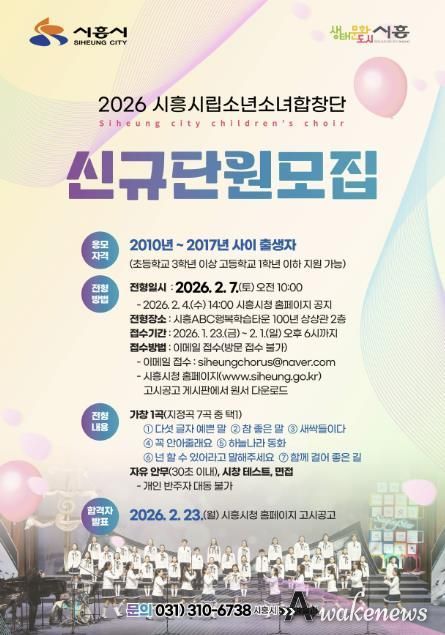 어웨이크뉴스 오경하 기자 | 시흥시는 시흥의 문화사절단으로서 아름다운 화음을 함께 만들어 갈 ‘2026년도 시흥시립소년소녀합창단’의 신규단원을 공개 모집한다.