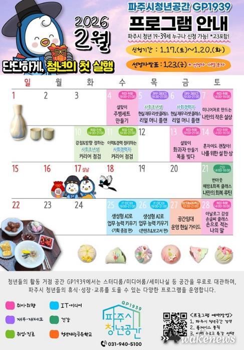 어웨이크뉴스 오경하 기자 | 파주시청년공간 지피(GP)1939가 오는 2월 한 달간 청년을 위한 맞춤형 프로그램에 참여할 참여자를 모집한다.
