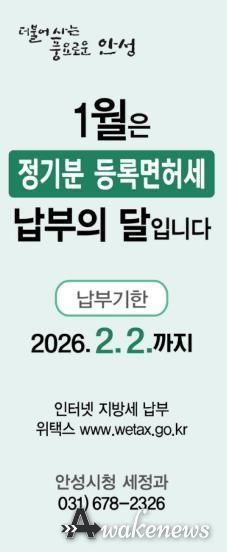 어웨이크뉴스 오경하 기자 | 안성시는 2026년도 정기분 등록면허세(면허분) 4만 2,100건에 대해 총 5억 5천만 원을 부과했다고 밝혔다.