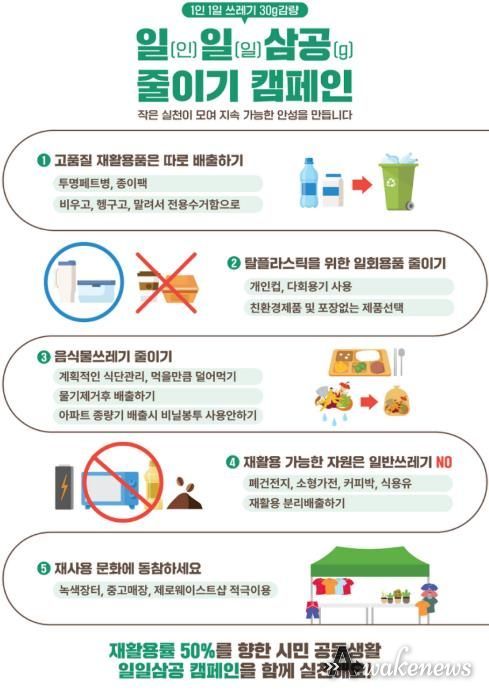 어웨이크뉴스 오경하 기자 | 안성시는 시민의 자발적인 실천을 통해 재활용률을 높이고 생활쓰레기 발생량을 줄이기 위한 ‘1인 1일 쓰레기 30그램 줄이기(일일삼공) 캠페인’을 적극 추진하고 있다고 밝혔다.