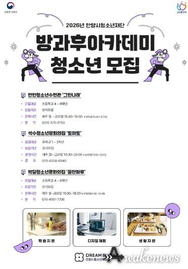 어웨이크뉴스 오경하 기자 | 안양시청소년재단은 공공 청소년 돌봄 사업인 청소년방과후아카데미의 2026년도 참여 청소년을 모집한다.