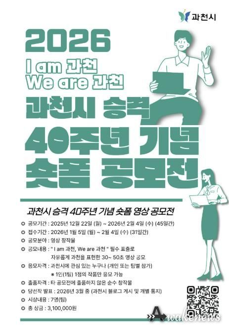 어웨이크뉴스 오경하 기자 | 과천시는 시 승격 40주년을 맞아 ‘숏폼 영상 공모전’을 개최하고, 오는 2월 4일까지 작품을 모집한다고 밝혔다.