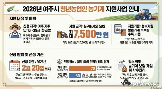 어웨이크뉴스 오경하 기자 | 여주시는 청년농업인의 안정적인 영농 정착과 경영 기반 강화를 위해 '2026년 청년농업인 농기계 지원사업'을 추진한다.