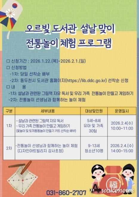 어웨이크뉴스 오경하 기자 | 동두천시 도서문화사업소는 설날을 맞아 오르빛도서관에서 유아를 동반한 가족과 저연령 청소년을 대상으로 ‘설날 맞이 전통놀이 체험 프로그램’을 2월 4일 운영한다.