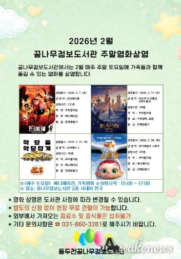 어웨이크뉴스 오경하 기자 | 동두천시 도서문화사업소 정보도서관은 2월 한 달간 매주 토요일 어린이와 가족을 대상으로 애니메이션 및 가족영화 4편을 상영한다고 밝혔다.
