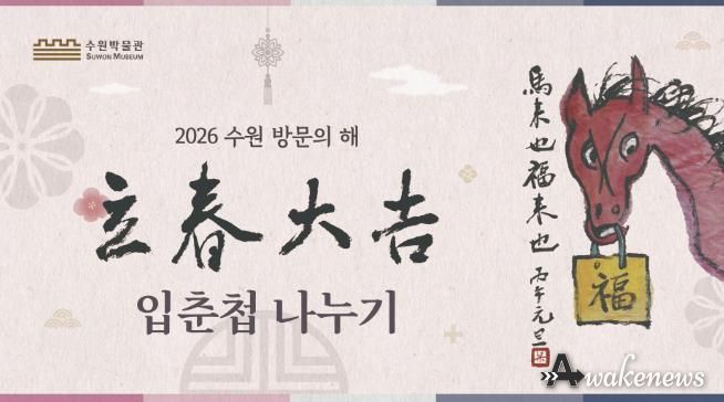 어웨이크뉴스 오경하 기자 | 수원박물관이 2026 수원 방문의 해를 맞아 1월 31일 오후 1시부터 3시까지 박물관 1층 로비에서 세시(歲時) 행사 ‘입춘첩 나누기’를 연다. 관람객에게 서예가 근당 양택동 선생의 친필 입춘첩을 배부한다.