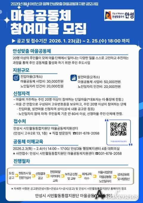 어웨이크뉴스 오경하 기자 | 안성시시민활동통합지원단 마을공동체지원센터는 주민이 스스로 마을의 문제를 발견하고 해결하며 함께 살아가는 공동체를 만들기 위해 ‘2026년 마을공동체 공모사업’을 추진한다고 밝혔다.