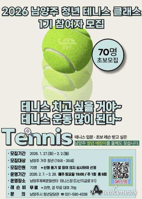 어웨이크뉴스 오경하 기자 | 남양주시는 27일부터 내달 2일까지 ‘2026 남양주 청년 테니스 클래스 1기’ 참여자를 모집한다고 밝혔다.