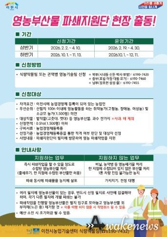신청 대상은 농업경영체에 등록된 농업인이며, 신청 기간은 4월 10일까지이다. 신청은 이천시농업기술센터 영농기술팀 또는 식량작물팀으로 하면 된다. 현장 파쇄작업은 2월 19일부터 4월 30일까지 진행된다.