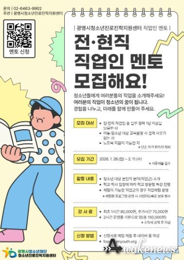 어웨이크뉴스 오경하 기자 | 광명시청소년재단 청소년진로진학지원센터는 관내 청소년들에게 현실적인 직업 정보와 체계적인 진로 설계 기회를 제공하기 위해 ‘2026년 직업인 멘토’를 신규 모집한다고 밝혔다.