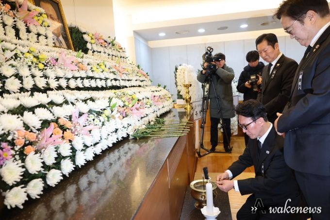 어웨이크뉴스 오경하 기자 | 김민석 국무총리가 27일 종로구 서울대학교병원 장례식장에서 故 이해찬 민주평통 수석부의장의 빈소를 조문하고 있다.