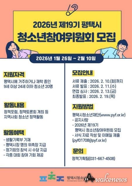 어웨이크뉴스 오경하 기자 | 평택시와 평택시청소년재단은 청소년 정책 참여 기회를 확대하고 자치 역량을 강화하기 위한 2026년 제19기 청소년참여위원회 위원 20명을 공개 모집한다고 밝혔다.