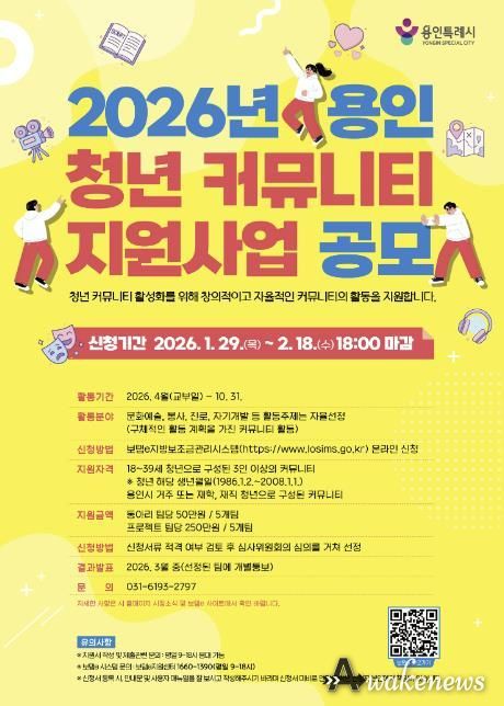 어웨이크뉴스 오경하 기자 | 용인특례시는 2월 18일까지 ‘청년 커뮤니티 지원사업’에 참여할 10개 팀을 모집한다고 29일 밝혔다.