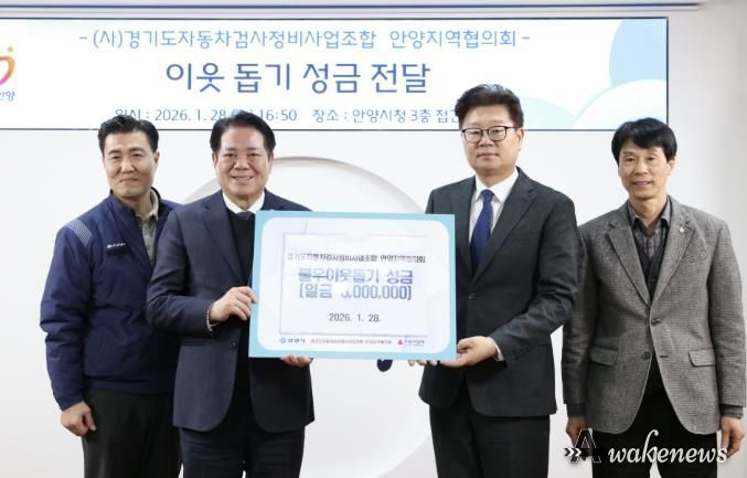 어웨이크뉴스 오경하 기자 | 안양시는 28일 오후 4시 50분에 시청 3층 접견실에서 (사)경기도자동차검사정비사업조합 안양지역협의회가 설 명절을 앞두고 지역 내 어려운 이웃을 위해 사용해 달라며 성금 300만원을 기탁했다고 29일 밝혔다.