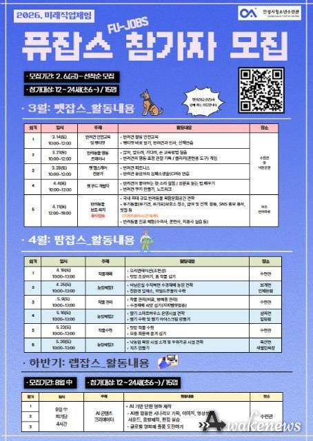 어웨이크뉴스 오경하 기자 | 안성시청소년수련관은 오는 2월 6일부터 청소년들의 진로 탐색과 미래 직업에 대한 이해를 돕기 위해 미래직업 체험 프로그램 “퓨잡스” 참가자를 선착순으로 모집한다.