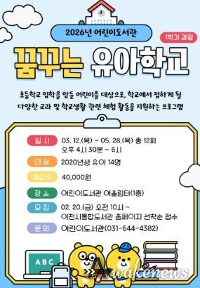 어웨이크뉴스 오경하 기자 | 이천시 어린이도서관은 초등학교 입학을 앞둔 2020년생 유아를 대상으로 독서·체험 프로그램인 ‘2026년 꿈꾸는 유아학교’를 운영한다.