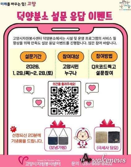 어웨이크뉴스 오경하 기자 | 고양시자원봉사센터 덕양분소가 시설과 운영 프로그램의 서비스 질 향상을 위해 고양시민과 자원봉사자 대상 만족도 조사를 실시한다고 밝혔다.